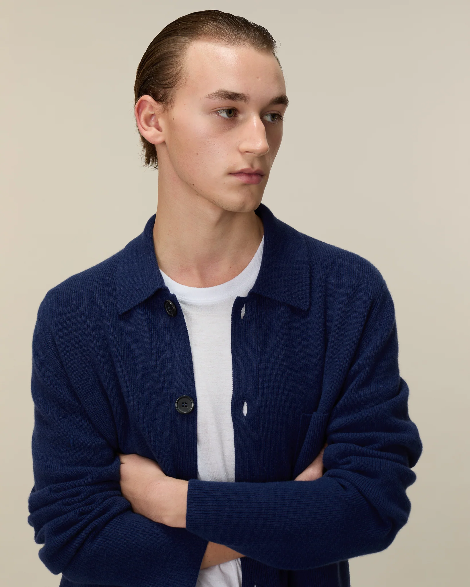 This work jacket in wool and cashmere reinterprets an iconic piece of French heritage through knitwear. Crafted in a dense yet supple knit, it combines softness and structure, with three practical patch pockets and a timeless straight cut. Functional and refined, it can be worn year‑round, embodying the effortless attitude of French style.