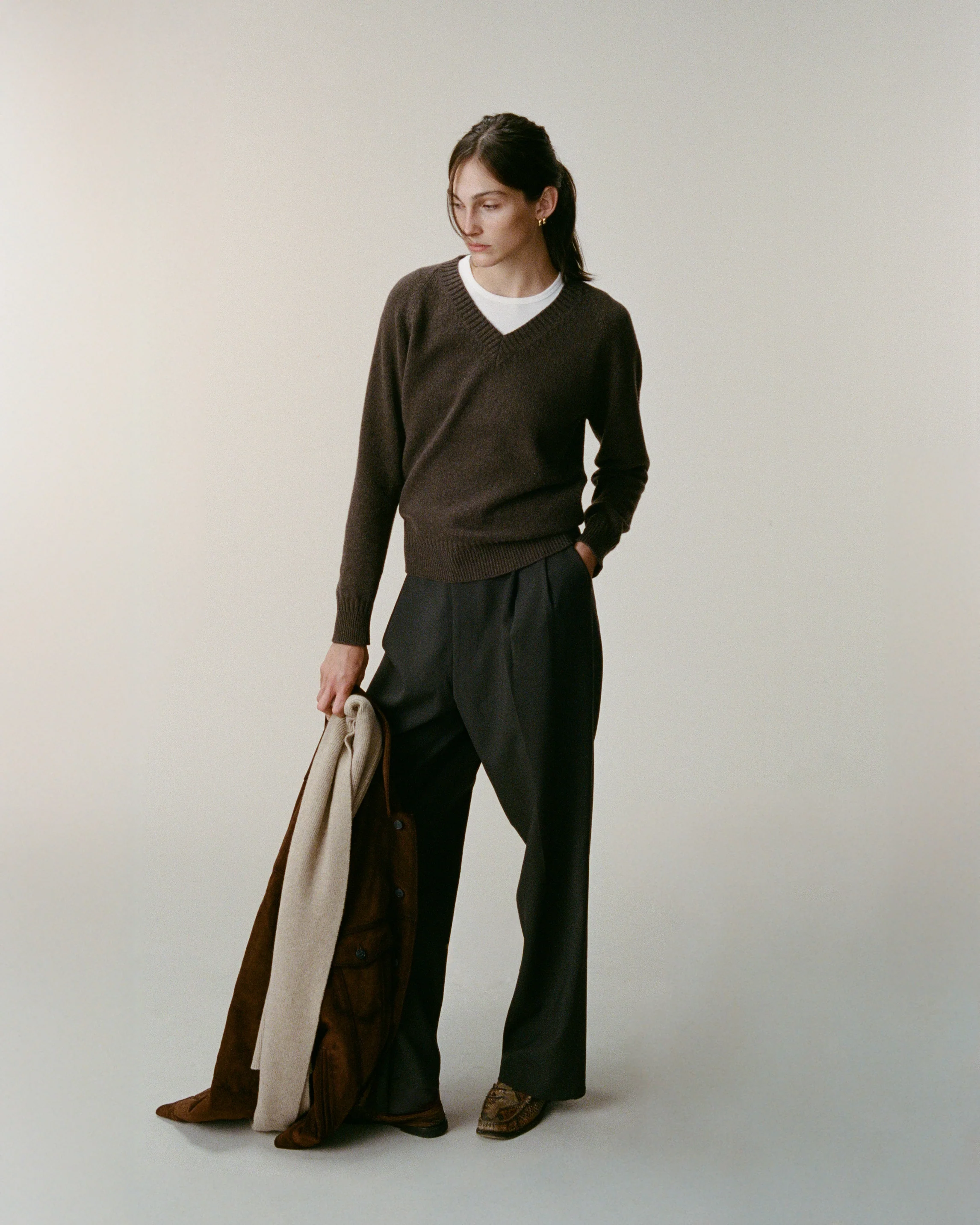 Knitted in dense yet soft cashmere, the deep V‑neck elevates a timeless essential with its oversized fit and boxy volume. A clean silhouette that flatters every shape, it balances relaxed ease with refined elegance. Built to endure, it unites comfort and modernity in an effortless staple.